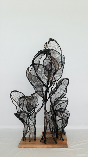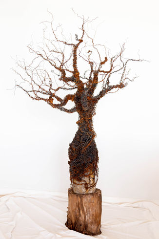 El alambre como material lo comencé a usar por un impulso a querer quebrar un proceso académico y poder soltar mi mano y mi mente para alejarlo de la copia. El alambre modifica la imagen exacta que tengo en mi cabeza, me permite errar y no solo me posibilita estructurar o planificar sino que también es un material que va transformando las ideas en el andar debido a sus mil maneras de modelarse y de adaptarse. Relaciono íntimamente este material con la imagen del árbol; ambos me traen a la vivencia de un tiempo presente y me acercan a esa naturalidad que uno posee de niño que al crecer muchas veces se olvida. A su vez es un material que me permite modificar la obra a lo largo de los años, mis obras no son creadas para ser terminadas sino que, como el árbol, van mutando con el pasar del tiempo.